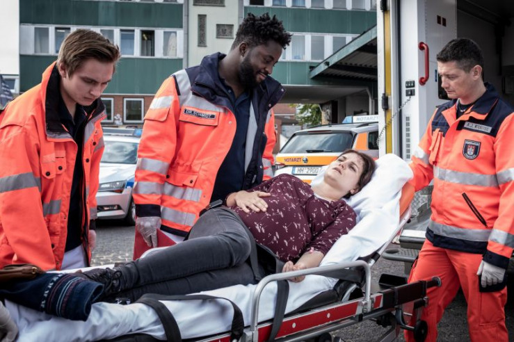 Jetzt ist Eile geboten: Während der Behandlung durch Dr. Haase (Fabian Harloff, 2.v.l.) verliert der Kurierfahrer Jan Wojcik (Kai Müller) das Bewusstsein.