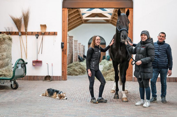 Wie der Herr des Hauses posiert der Junghengst auf Gut Schönweide mit seinen Zuarbeitern, die tagtäglich dafür sorgen, dass es ihm an Nichts fehlt.