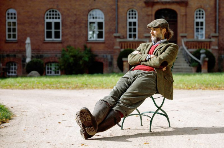 Host Constantin von Westphalen sitzt vor dem Gut Wittmoldt, schwelgt in Erinnerungen und erzählt Anekdoten von dem historischen Gut.