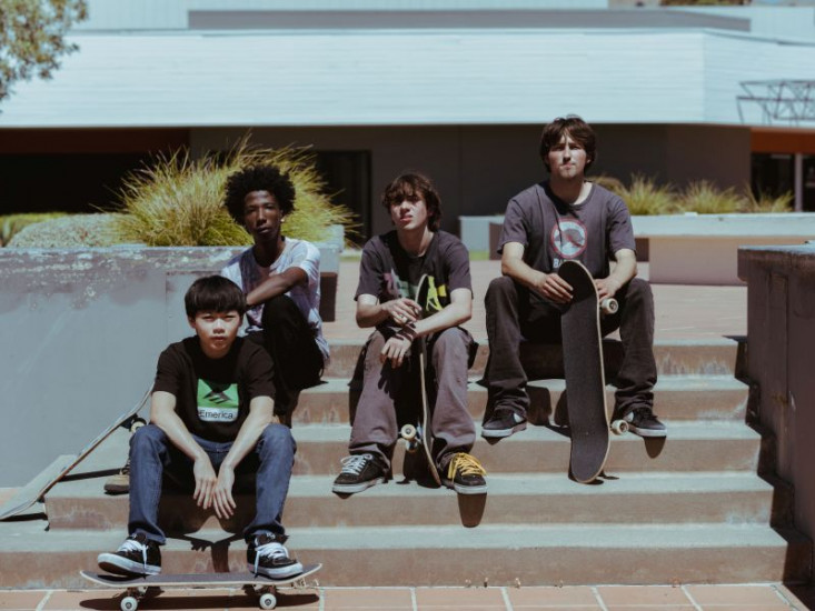 (L to R) Izaac Wang as "Chris Wang", Aaron Chang as "Soup", Tarnvir Kamboj as "Hardeep", and Raul Dial as "Fahad" in writer/director Sean Wang's DĖDI, a Focus Features release. Credit: Courtesy of Focus Features / Talking Fish Pictures, LLC.
