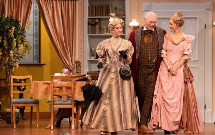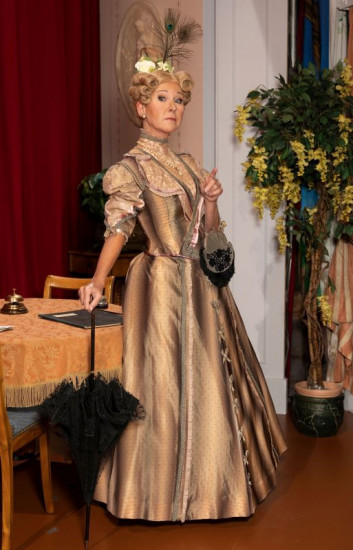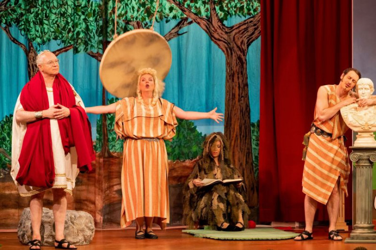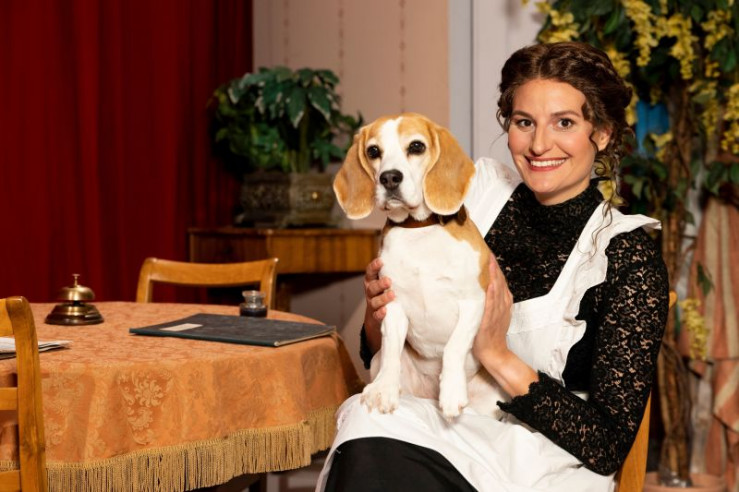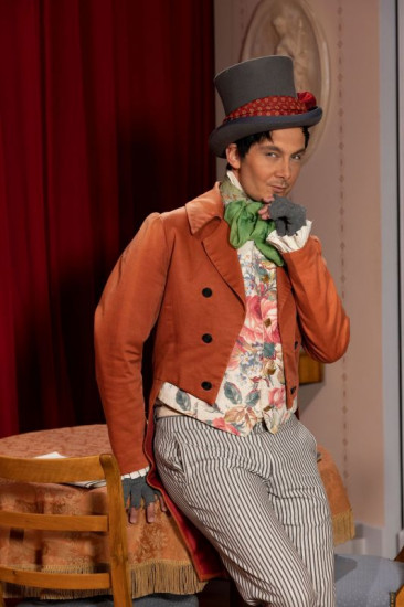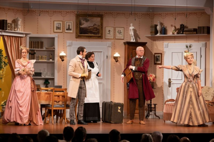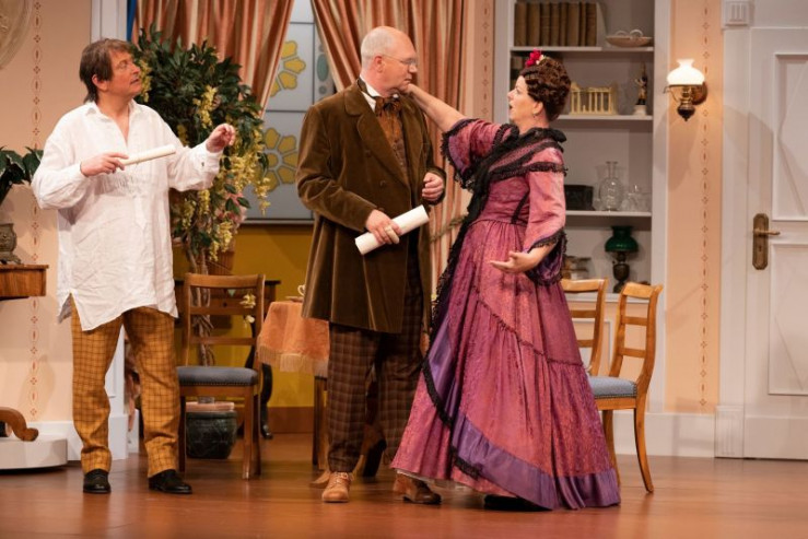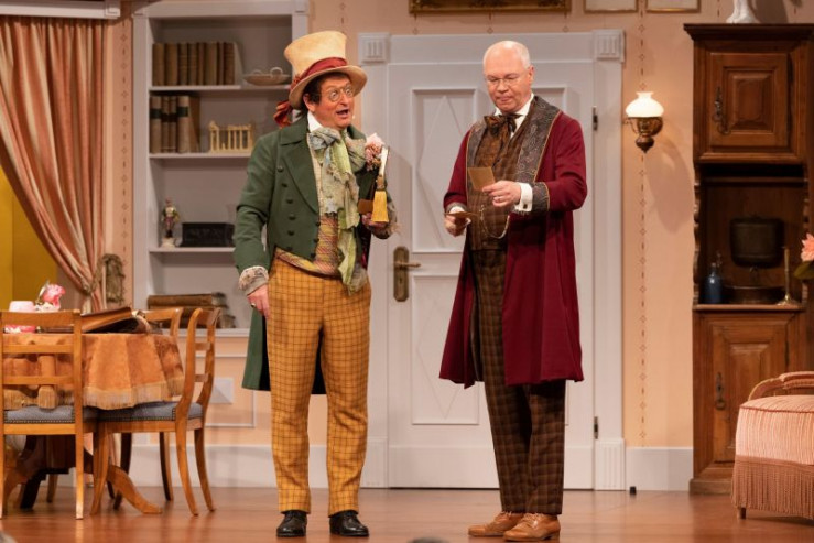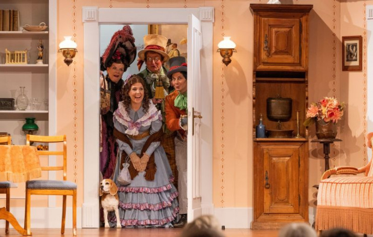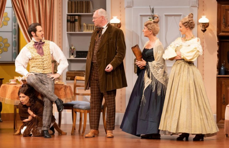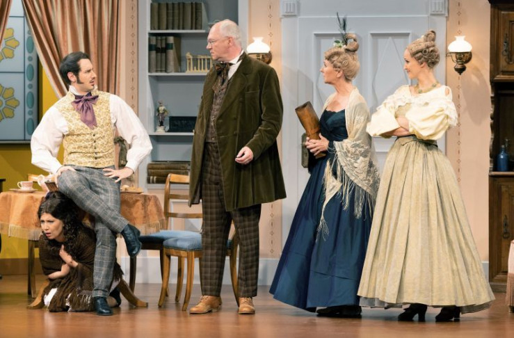Ein Missverständnis jagt das andere. Hilde (Christin Deuker) muss sich unter dem Tisch verstecken, während Julius (Patric Dull, links) seinen Vater Walter (Martin Rassau) nebst Mutter (Karin Schubert) und Schwester Flavia (Sabrina Anderlik, rechts) abzulenken versucht. Weiteres Bildmaterial finden Sie unter www.br-foto.de.