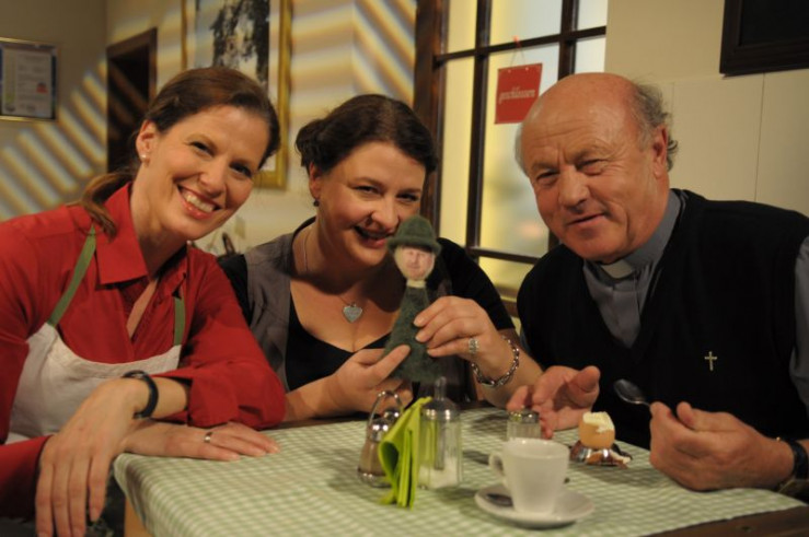 Monika fordert Schattenhofer auf, für den baldigen "Essen Dahoam-Basar" auch was zu spenden. Von links: Bürgermeister Schattenhofer (Werner Rom), Trixi Preissinger (Doreen Dietel) und Monika Vogl (Christine Reimer).