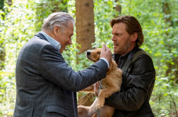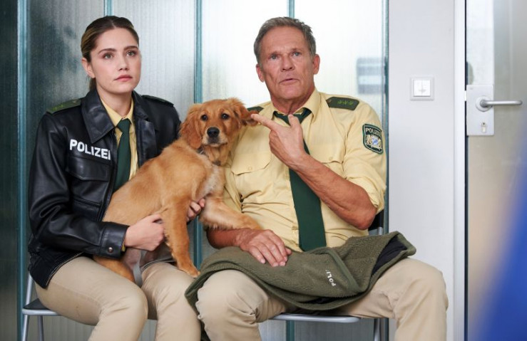 Holger Ermisch (Tobias Kay, rechts) kommt mit dem Welpen zur Übergabe. Hat Girwidz (Michael Brandner, links) sich etwa gerade verliebt?