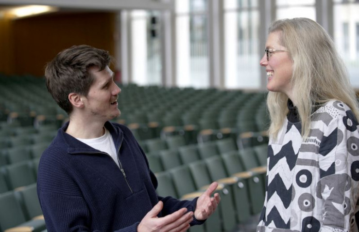 Frank Seibert und Kristin Drenkhahn im Auditorium der FU Berlin. Die Professorin ist eine der wenigen Gefängnisforscherinnen in Deutschland. Sie untersucht das soziale Klima in Gefängnissen.