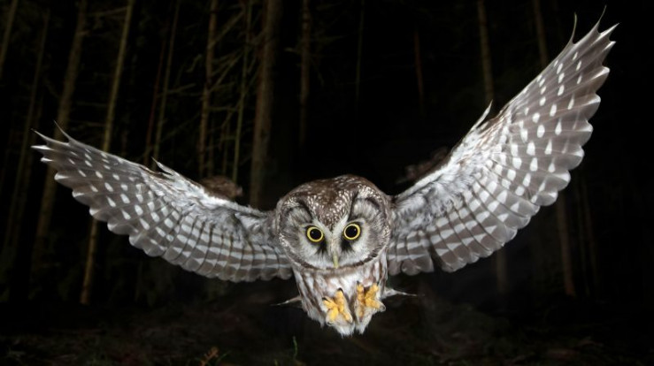 "Die Nacht erwacht! Über Leben im Wald" zeigt das Leben der nachtaktiven Gelbhalsmaus und ihrem Gegenspieler, dem Raufußkauz (Bild), von der längsten bis zur kürzesten Nacht eines Jahres.