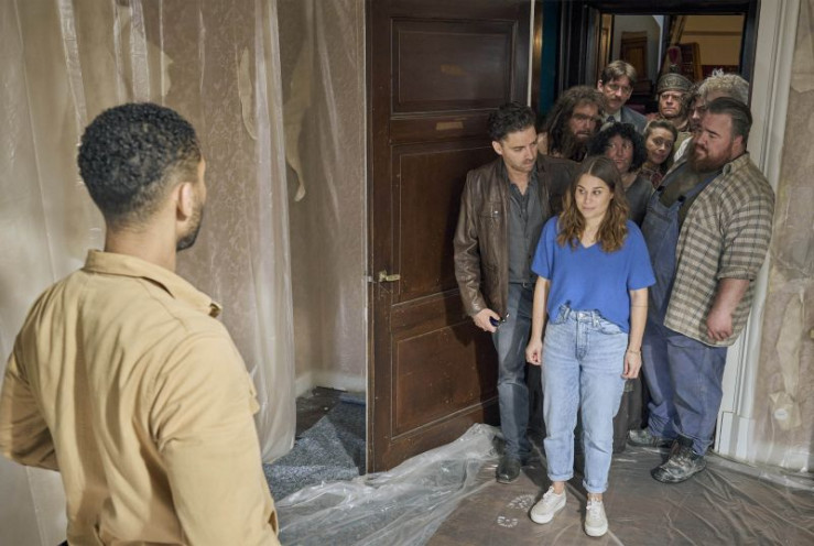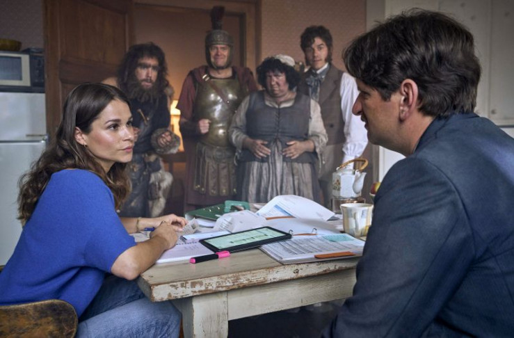 Die Geister heißen Ralf willkommen. (v.l.n.r.) Claudius (Max Giermann), Urs (Jan van Weyde), Griet (Meltem Kaptan).