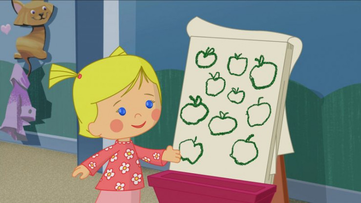 Zoé spielt mit ihren Freunden Schule. Sie sollen heute die Äpfel auf ihrer Tafel zählen.
