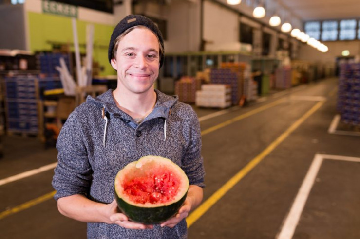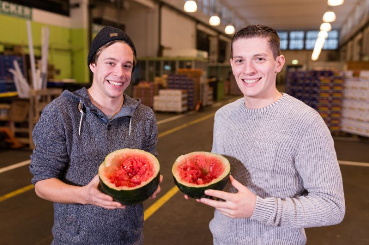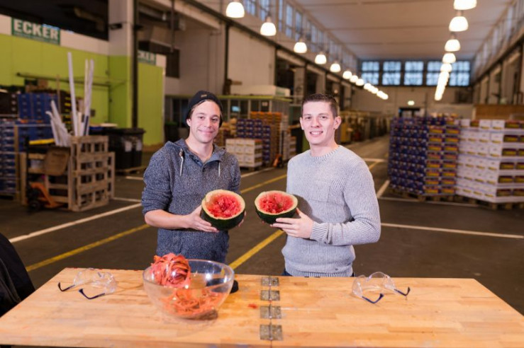 Checker Tobi (li.) und Koch Tom Wendel (re.) mit einer halben Melone.