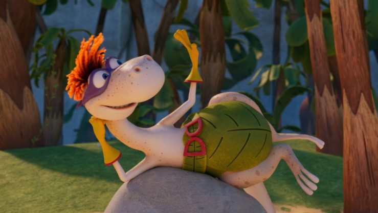 Super-Flint (M.) rettet vermeintlich das Haustier Lucy (l.) von einem Baum. © ZDF/M.A.R.K.13/TRIKK17/Fabrique d'image - Honorarfreie Verwendung gemäß AGB im redaktionellen Zusammenhang mit genannter Sendung bei Nennung "Bild: ZDF/M.A.R.K.13/TRIKK17/Fabrique d'image" einschließlich Social Media Einschließlich Social Media© ZDF/M.A.R.K.13/TRIKK17/Fabrique d'image - Honorarfreie Verwendung gemäß AGB im redaktionellen Zusammenhang mit genannter Sendung bei Nennung "Bild: ZDF/M.A.R.K.13/TRIKK17/Fabrique d'image" einschließlich Social Media Einschließlich Social Media