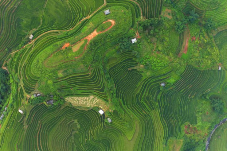 Die ganze Familie hilft bei der Ernte auf den Reisterrassen.