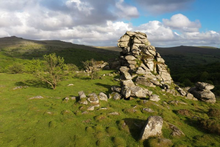 Die ausgedehnte Hochmoorlandschaft ist geprägt von weiten Heidelandschaften, grasbedeckten Hügeln und Granitfelsen, den sogenannten Tors, die in markanten Formationen aus der Erde ragen.