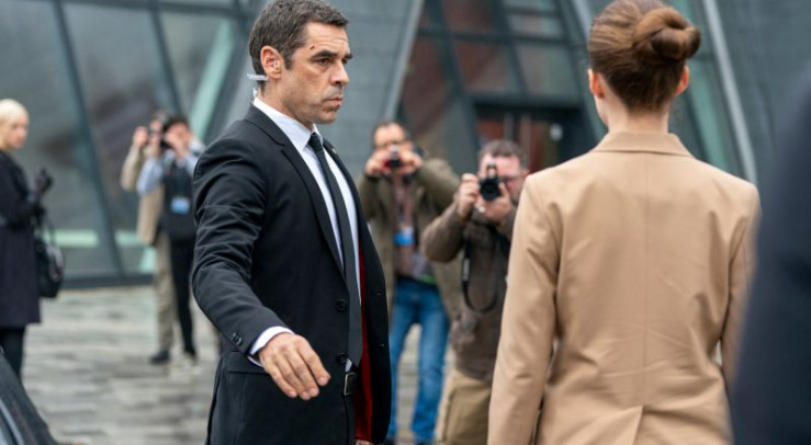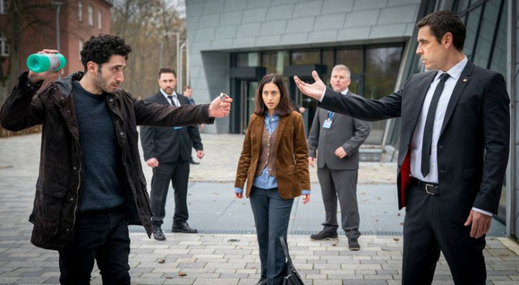 BKA-Beamte Jan Schäfer (Tobias Oertel, li.) im Pressetrubel um die Kronzeugin Fiona Weibel (Marlene Tanczik, r.e).