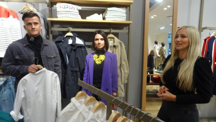 Kandidatin Lena (r.), Shoppingbegleitung Robin und eine Verkäuferin.