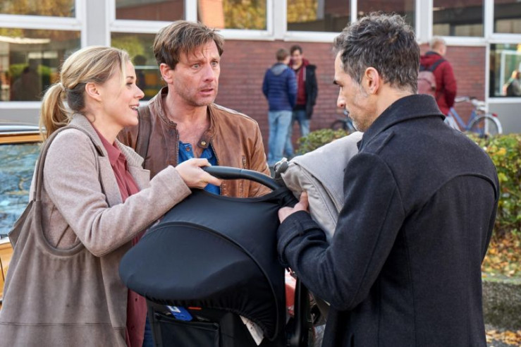 Stefan (Hendrik Duryn) und Karin (Jessica Ginkel) übergeben Frida an Michael (Gabriel Merz, r.). Denn Stefan soll nacheinander von Sievers und Michael und Karin von Barbara mit je einem Junggesellenabend bespaßt werden. Stefans Begeisterung hält sich in Grenzen, aber natürlich ist er kein Spielverderber...