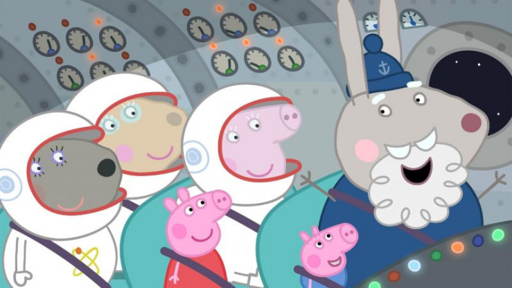 Oma Wutz (hi.mi.), ihre Freundinnen (li.), Peppa (vo.mi.) und Schorsch (2.v.re.) spielen heute die Apollo Mondlandung nach. Opi Mümmel (re.) hat ihnen sogar seine Rakete ausgeliehen. Als alle an Bord sind, startet Opi Mümmel die Rakete und fliegt bis zum Mond. +++ Die Verwendung des sendungsbezogenen Materials ist nur mit dem Hinweis und Verlinkung auf RTL+ gestattet. +++