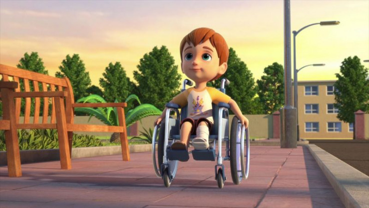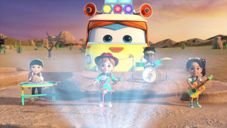 Der Bus von Trevor und seiner Band (li.) hat eine Reifenpanne und kann nicht weiterfahren. Nun stecken sie mitten in der Mojave-Wüste in Kalifornien fest. Super Wing Sunny (re.) eilt zur Unterstützung herbei und hat eine großartige Idee. Sie schlägt vor, das Konzert mit zwei Holoprojektoren gleichzeitig zum Times Square und nach Los Angeles zu Tom zu übertragen, sodass er das Konzert seiner Lieblingsband aus dem Krankenhaus live verfolgen kann.