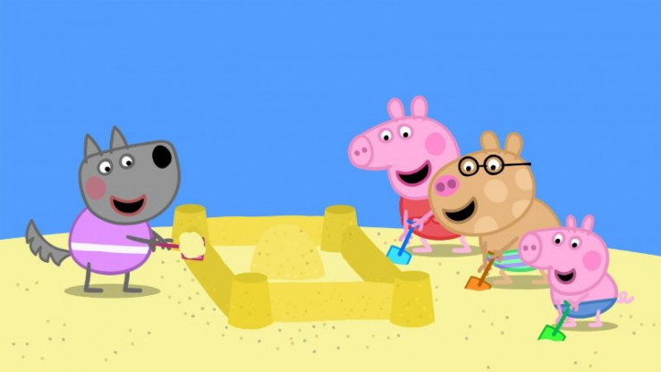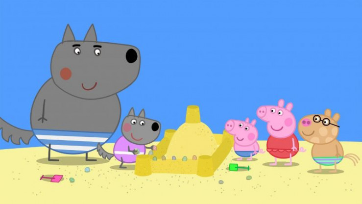 Zusammen mit ihren Freunden und Schorsch (mi.) baut Peppa (2.v.re.) eine große Sandburg am Strand. Sie hat einen Graben, ein Tor, Fenster und eine kleine Krabbe, die nun ein neues Zuhause hat. +++ Die Verwendung des sendungsbezogenen Materials ist nur mit dem Hinweis und Verlinkung auf RTL+ gestattet. +++
