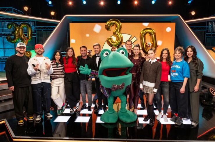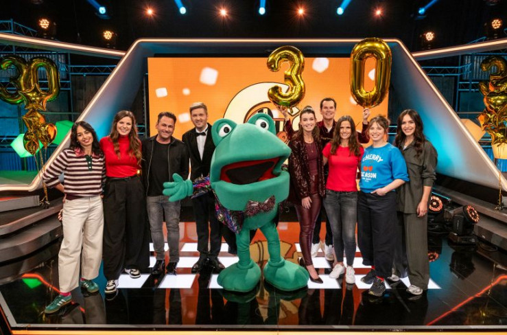 30 Jahre Tigerenten Club. Von links: FAYAN, DJ Nico, Muschda Sherzada, Amelie Stiefvatter, Dennis Willms, Jan (von Jan & Henry, Puppenspieler Martin Reinl), Johannes Zenglein, Günter Kastenfrosch, Malte Arkona, Laura Knöll, Henry (von Jan & Henry, Puppenspieler Carsten Haffke), LINA (Lina Larissa Strahl), Pamela Großer, Katharina Gast und Jess Schöne