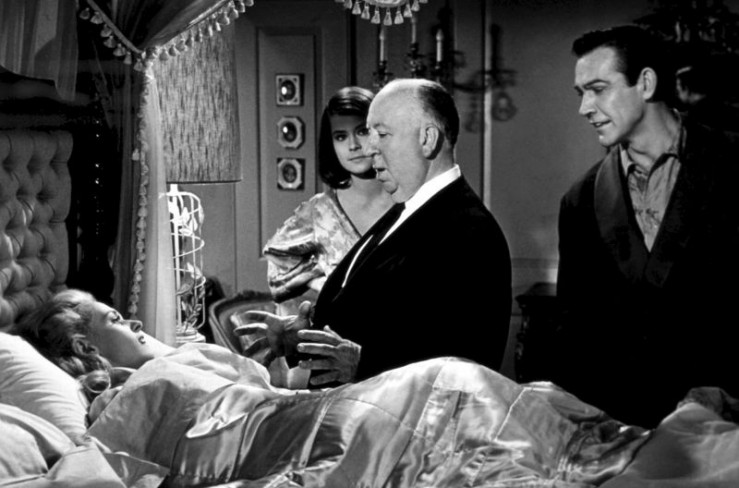 Tippi Hedren (li.), Alfred Hitchcock (Mi.) und Sean Connery (re.) während der Dreharbeiten zu "Marnie" (USA, 1964)