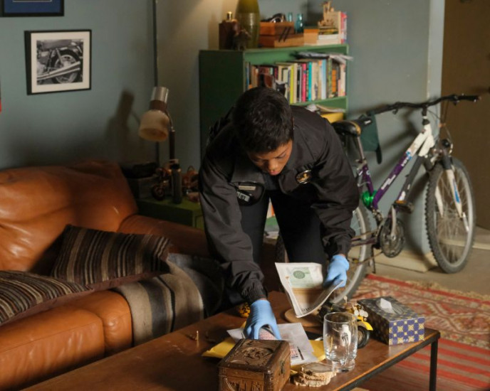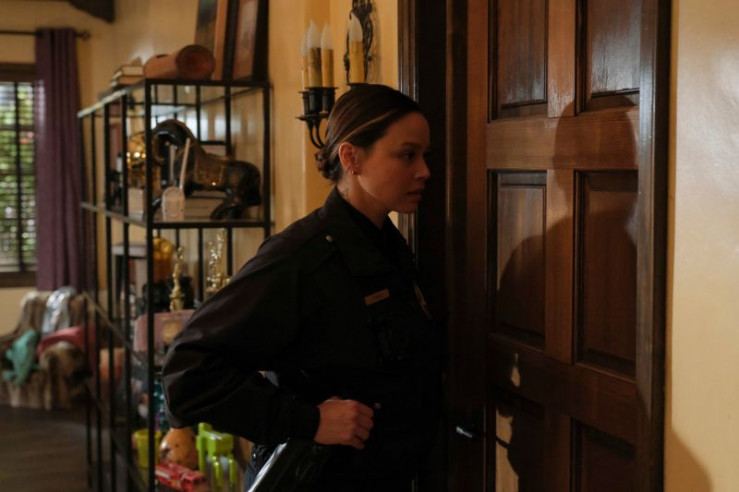 John Nolan (Nathan Fillion) und Talia Bishop (Afton Williamson) stürmen eine Wohnung zur Durchsuchung.