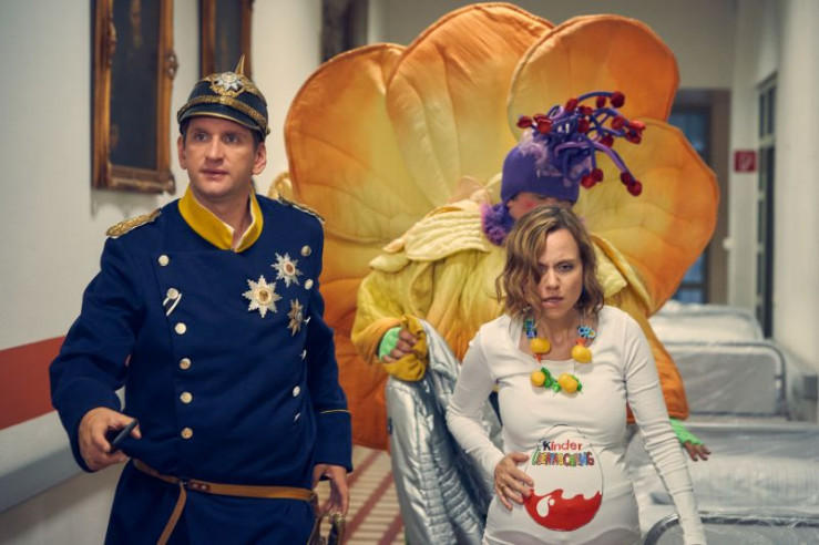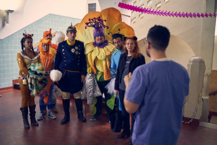 Nach und nach kommen die verkleideten Eltern im Krankenhaus an, um Beistand bei der Geburt zu leisten.