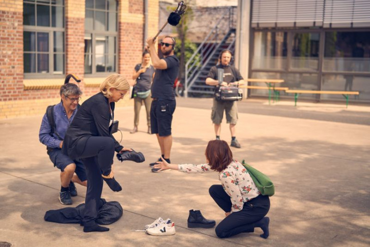 Nina (Lavinia Wilson, r.) hat zu ihrem Bewerbungsgespräch aus Versehen zwei verschiedene Sneaker angezogen und zwingt ihre Mutter Ini (Johanna Gastdorf, l.) daraufhin, zum Schuhtausch.
