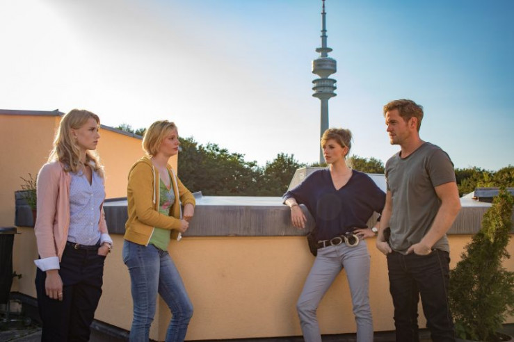 Dominik Morgenstern (Joscha Kiefer, r.) und Resi Schwaiger (Mersiha Husagic, 2. v. r.) befragen Michi Lenner (Berit Vander, 2. v. l.) und Nancy Wengler (Sinje Irslinger, l.).