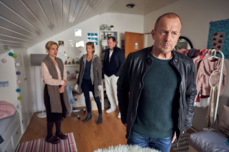 Ingo Thiel (Heino Ferch, r.) und seine Kollegin Conny (Sina Bianca Hentschel, 2. v. l.) suchen mit den Eltern Christa Sommer (Sandra Borgmann, l.) und Holger Sommer (Martin Lindow, 2. v. r.) im Kinderzimmer von Nele nach Hinweisen für ihr Verschwinden.