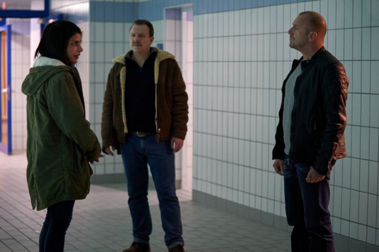 Ingo Thiel (Heino Ferch, r.) und Winni (Ronald Kukulies, M.) wollen von der Schwimmtrainerin Lisa Fechner (Shadi Hedayati, l.) wissen, ob Nele irgendwelche Problem hatte.