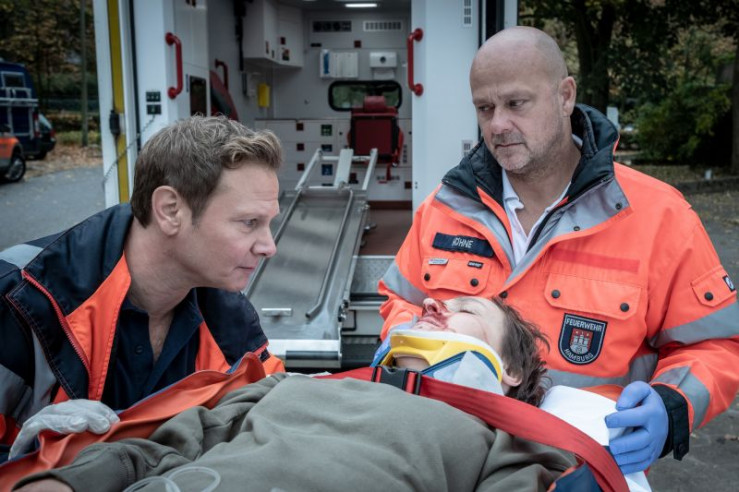 Dr. Haase (Fabian Harloff, l.) kümmert sich um Tanja Kessler (Lotte Ohm), die beim Versuch, den Entführer ihres Sohnes zu verfolgen, von einem Auto angefahren wurde.