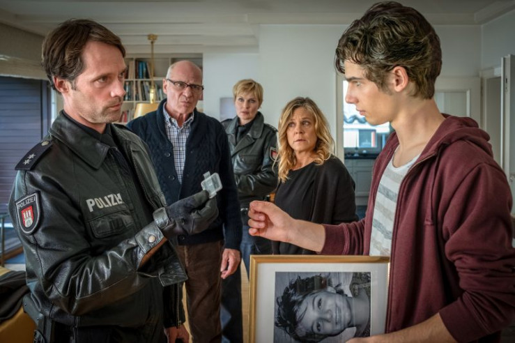 Im Beisein von Janniks Mutter (Tina Eschmann, l.) und dessen Opa (Rüdiger Kuhlbrodt, 2.v.l.) reden Mattes (Matthias Schloo, M.) und Melanie (Sanna Englund, r.) Jannik (Orlando Lenzen, 2.v.r.) ins Gewissen, um herauszufinden, ob er mehr vom Vorhaben seines Vaters weiß.