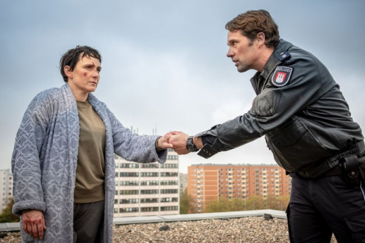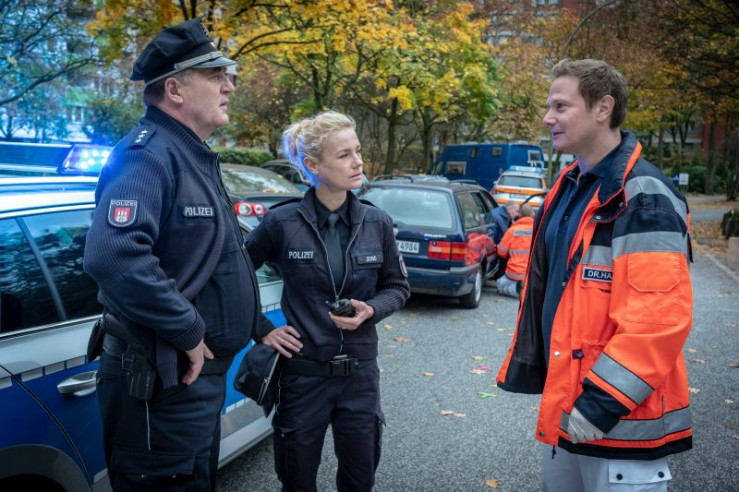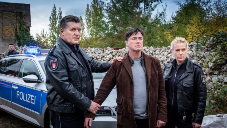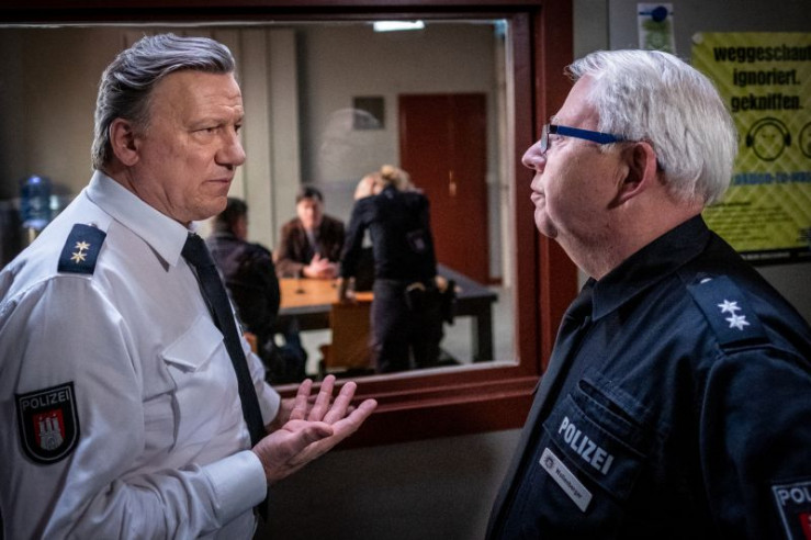Haller (Hannes Hellmann, l.) berät mit Wolle (Harald Maack, r.) das weitere Vorgehen im Fall Christoph Maas (Uwe Bohm, hinten Mitte), der sich geweigert hat, mit dem LKA zu sprechen.