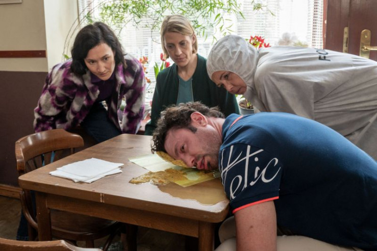 Der verhasste Vermieter Hugo Wilke (Daniel Völz) erstickt beim Essen einer Suppe. Für Spusi Jutta Specht (Gabriele Völsch, 2.v.r.) deutet alles auf Gift hin. Pauline Hobrecht (Agnes Decker, l.) und Tamara Meurer (Anja Pahl, 2.v.l.) müssen jetzt herausfinden, wer es auf den auf den "Großgrundbesitzer" abgesehen hatte. An Mordverdächtigen mangelt es den Ermittlerinnen nicht.
