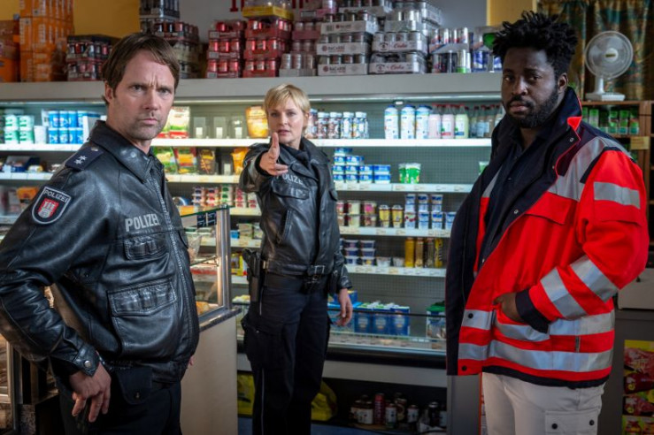 Franzi (Rhea Harder-Vennewald, M.) und Hans (Bruno F. Apitz, r.) befragen Demir Kaplan (Neil Malik Abdullah, l.) zu dem Überfall auf seinen Laden, doch Kaplan ist mit den Gedanken bei seiner Tochter, die angeschossen wurde.