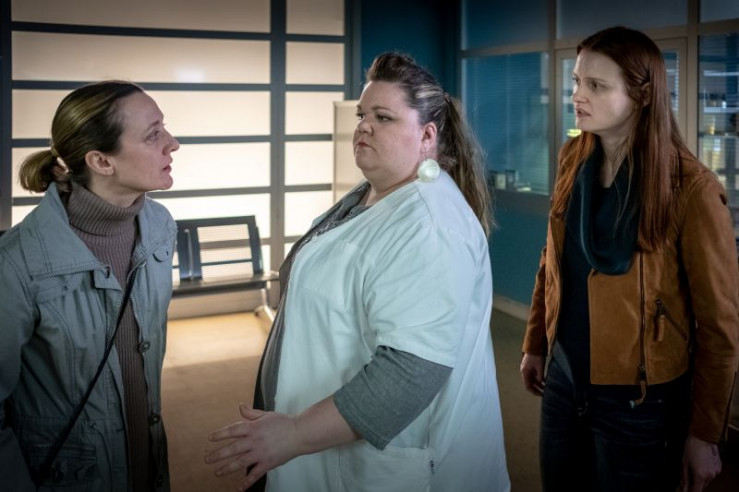 Melanie (Sanna Englund) und Mattes (Matthias Schloo, M.) zeigen Jörn Gutscheidt (Christoph Glaubacker, r.) ein Foto der Täterin. Doch Gutscheidt kann nicht mit Gewissheit sagen, ob es sich bei dem Mädchen um das gleiche handelt, das ihn mit der Eisenstange angegriffen hat.