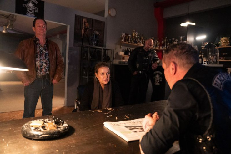 Vera Lanz (Katharina Böhm, 2.v.l.) und Paul Böhmer (Jürgen Tonkel, l.) setzen den Anführer der Motorradgang "Black Orders", Sascha Wendt (Gerdy Zint, r.), unter Druck.