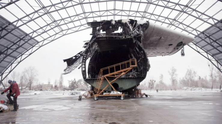 Welt flog. Hier im Januar 2025 vor der zerschossenen MRIJA auf dem durch den Krieg zerstörten ANTONOV-Werksflughafen in Hostomel bei Kyjiw.