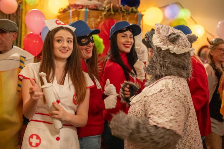 Hubert ist überrascht, dass Sophia und Winkler das selbe Kostüm wie er und Uschi haben. Von links: Hubert (Bernhard Ulrich), Winkler (Florian Stadler) und Sophia (Patricia Freund).