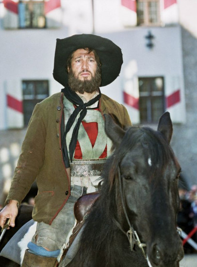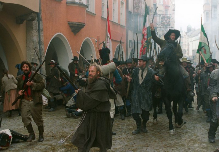 Pater Joachim Haspinger (Franz Xaver Kroetz, vorne) und Andreas Hofer (Tobias Moretti, rechts, reitend) führen die aufständischen Bauern in der Schlacht um Innsbruck an.