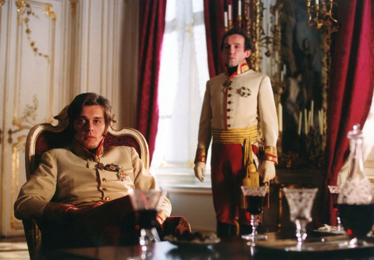 Napoleon I. Bonaparte (Gustav-Peter Wöhler) umwirbt Marie Luise von Habsburg (Sarah Jung), die Tochter von Kaiser Franz I. von Österreich (Christian Futterknecht, von links).