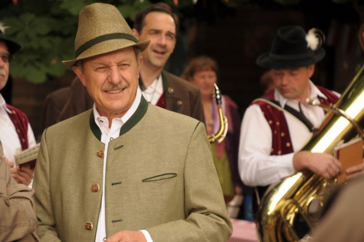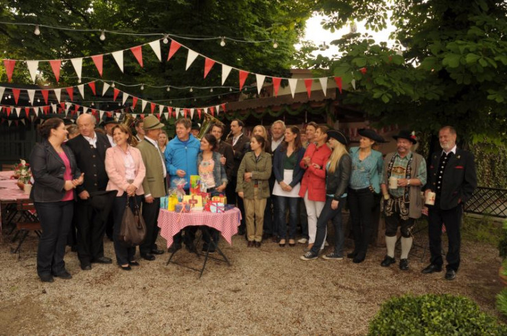 Die Lansinger begrüßen Bamberger mit der Frankenhymne zu seiner Geburtstagsfeier. Von links: Monika Vogl (Christine Reimer), Pfarrer Kurz (Hans Stadlbauer), Rosi Brunner (Brigitte Walbrun) und Bürgermeister Schattenhofer (Werner Rom).