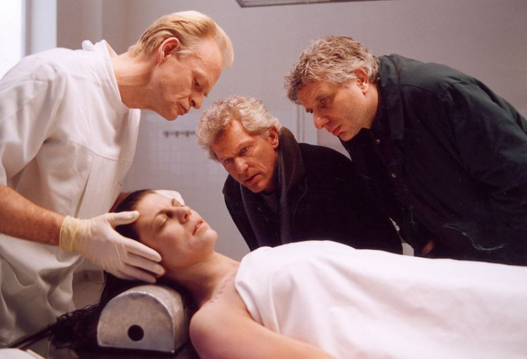 Der Pathologe (Wolfgang Czeczor, links) zeigt den beiden Kriminalhauptkommissaren Ivo Batic (Miroslav Nemec, Mitte) und Franz Leitmayr (Udo Wachtveitl, rechts) Fingerabdrücke an der Leiche Stefanie (Katja Jerabek).