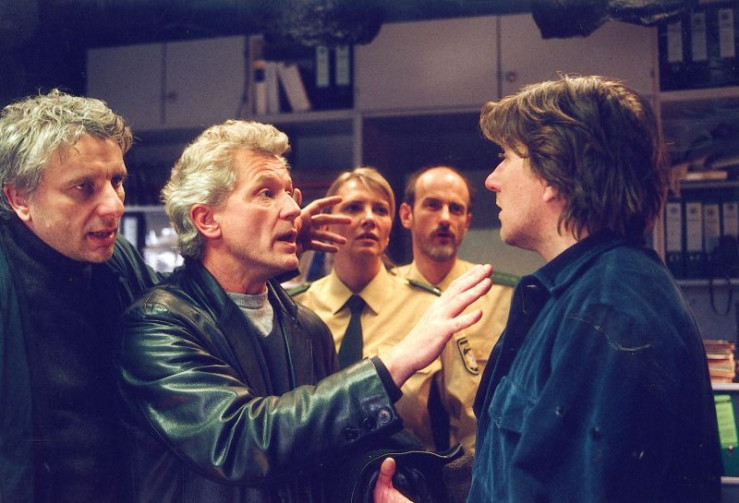 Ludwig Thaller (Michael Brandner, rechts) ergreift Selbstjustitz und verfolgt den Verdächtigen Jasper Bruckner (Jan Henrik Stahlberg, 2. von links). Die beiden Kommissare Franz Leitmayr (Udo Wachtveitl, links) und Ivo Batic (Miroslav Nemec) können gerade noch Schlimmeres verhindern.