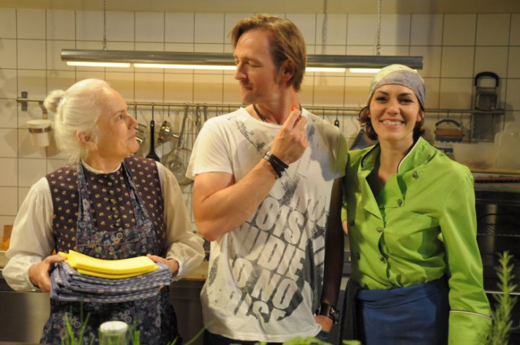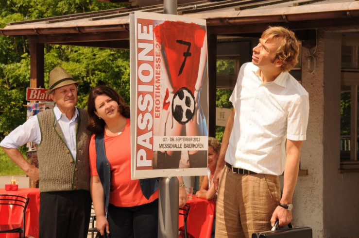 Schattenhofer und Moni halten von den Plakaten der Erotikmesse reichlich wenig. Von links: Trixi Preissinger (Doreen Dietel), Bürgermeister Schattenhofer (Werner Rom) und Monika Vogl (Christine Reimer).