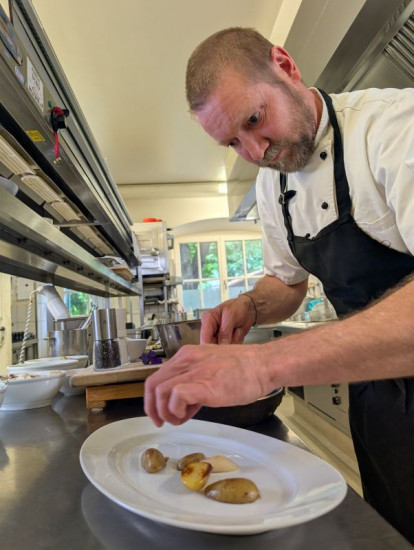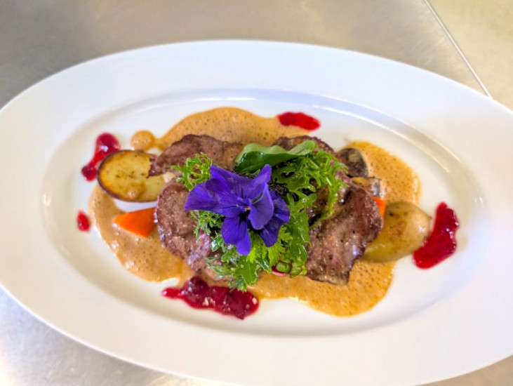 Rehschnitzel aus heimischer Jagd mit Wacholderrahmsoße auf Spargelgröstl und mariniertem Wildkräutersalat