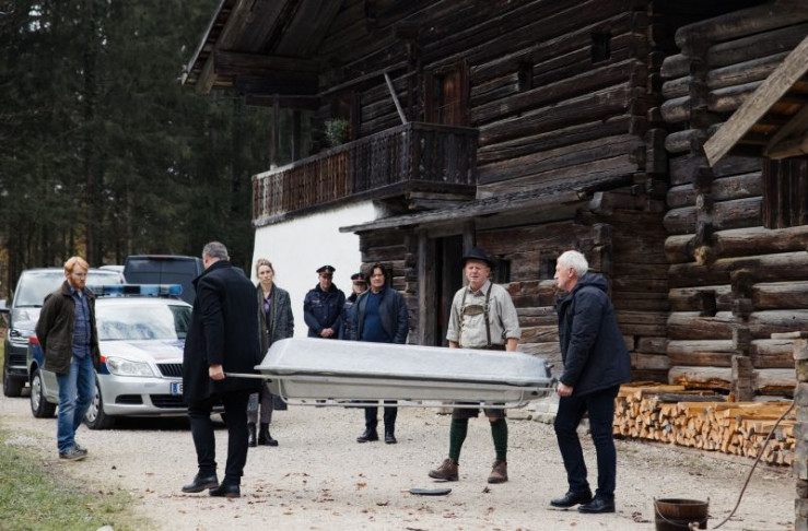 Freilichtmuseum: Das Ermittlerteam Ganslinger (Franz Josef Danner, li.), Anna Grünwald (Lisa Schützenberger, 3. v. li.), Kriminalpsychologe Meiberger (Fritz Karl) und der Vater des Opfers, Josef Ramsauer (Edi Jäger), beim Abtransport der Leiche.