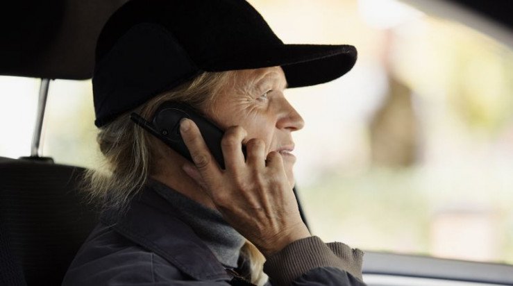 Inge Reiter (Sybille Kos) telefoniert in ihrem Taxi.
