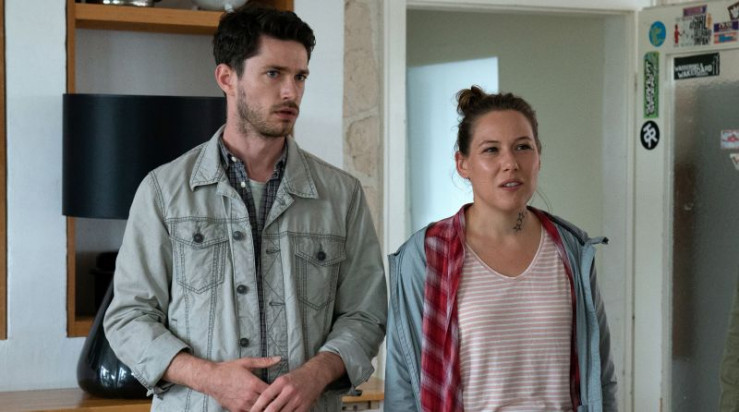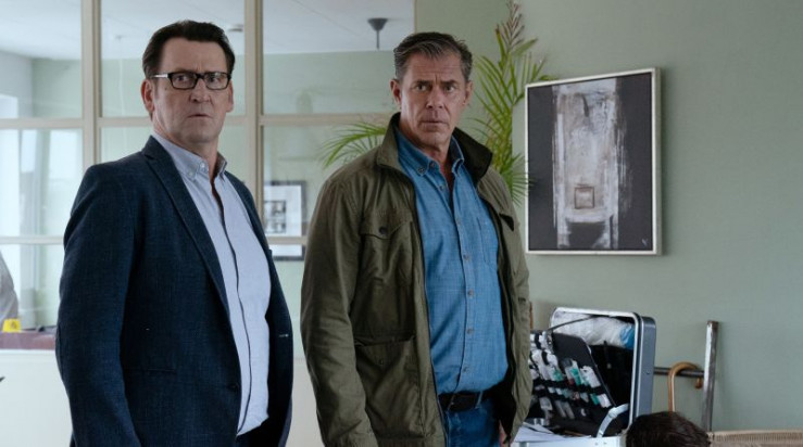 Finn (Sven Martinek, 3.v.l.) und Lars (Ingo Maujoks, 2.v.l.) sehen sich gemeinsam mit Nina (Julia E. Lenska, l.) am Tatort um. Strahl (Christoph Tomanek, r.) inspiziert die Leiche (Vinzenz Wagner, 2.v.r.).