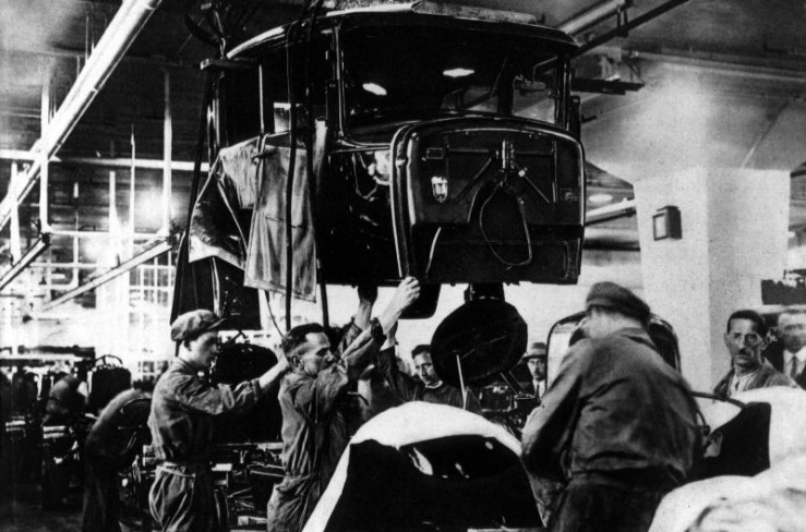 Mitarbeiter bei der Fließbandfertigung im Ford-Stammwerk Köln Niehl im Jahre 1931.