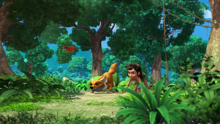 Beim Wettschwimmen taucht plötzlich das Krokodil Jakala (re.) auf. Mogli (li.) will es austricksen, um so Tabaqui, der irgendwo im Wasser ist, zu retten.
